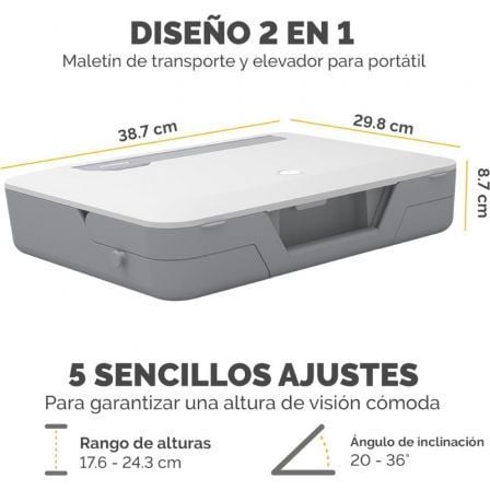 - Diseño 2 en 1: permite transportar y elevar el portátil.