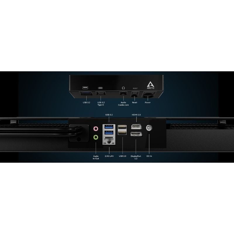 Un sistema completo que garantiza un espacio de trabajo ordenado, sin cables a la vista y sin dispositivos que distraigan. A diferencia de los PC de oficina o mini PC tradicionales, el ARCTIC Senza ofrece una configuración siempre limpia y profesional.