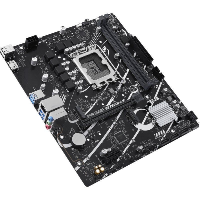 ASUS PRIME B760M-F, una placa base micro-ATX Intel® B760 LGA 1700 con PCIe 4.0, dos ranuras PCIe 4.0 M.2, DDR5, Ethernet Realtek de 1 Gb, HDMI™, SATA 6 Gbps, puertos USB frontales de 5 Gbps y Aura Sync.